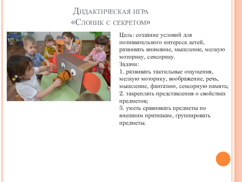 1. развивать тактильные ощущения, мелкую моторику, воображение, речь, мышление, фантазию, сенсорную память;
