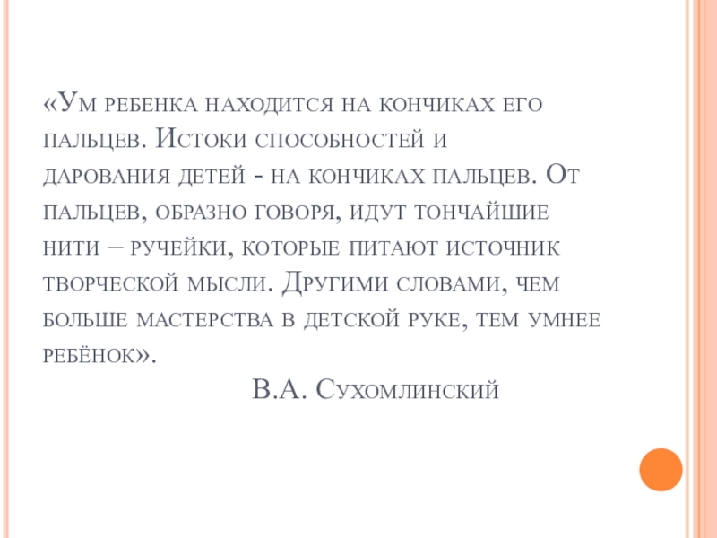 Слайд 2«Ум ребенка находится на кончиках его пальцев. Истоки способностей и дарования детей -
