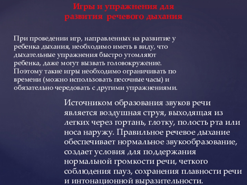 При проведении игр, направленных на развитие у ребенка дыхания, необходимо иметь в виду, что дыхательные упражнения быстро утомляют ребенка, даже могут вызвать головокружение. Поэтому такие игры необходимо ограничивать по времени (можно использовать песочные часы) и обязательно чередовать с другими упражнениями.