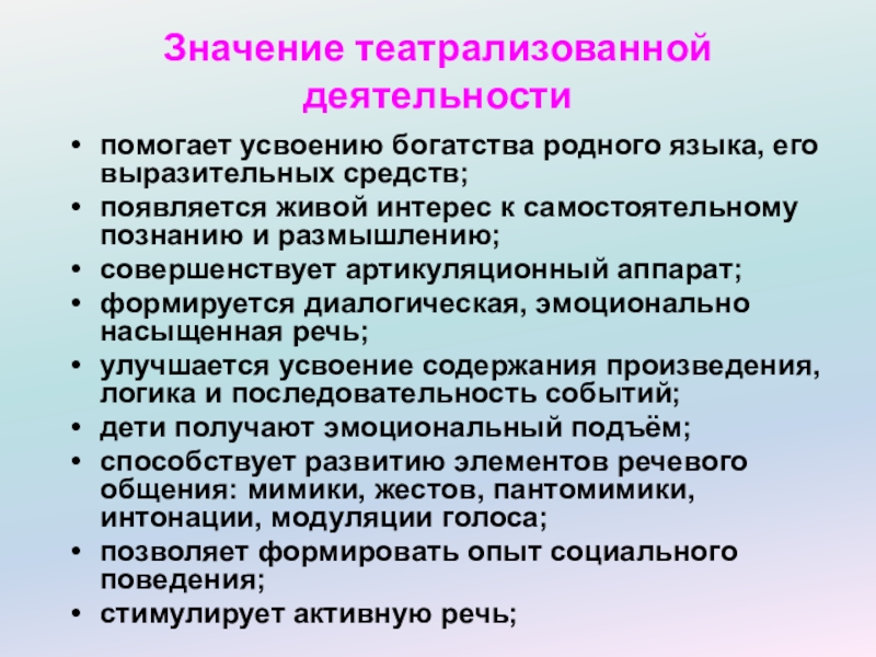Слайд 3Значение театрализованной деятельности