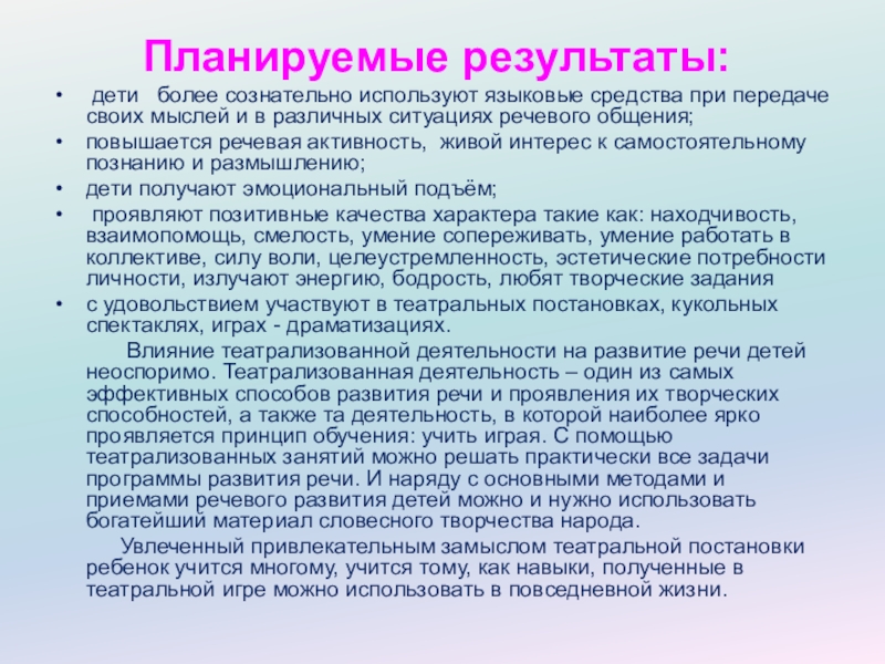 Влияние театрализованной деятельности на развитие речи детей неоспоримо. Театрализованная деятельность – один из самых эффективных способов развития речи и проявления их творческих способностей, а также та деятельность, в которой наиболее ярко проявляется принцип обучения: учить играя. С помощью театрализованных занятий можно решать практически все задачи программы развития речи. И наряду с основными методами и приемами речевого развития детей можно и нужно использовать богатейший материал словесного творчества народа.