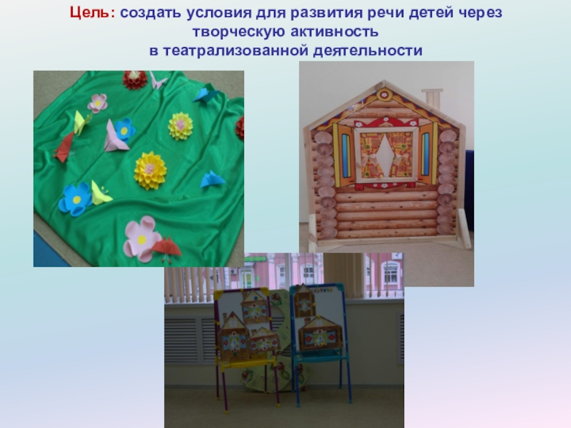 Слайд 4Цель: создать условия для развития речи детей через творческую активность