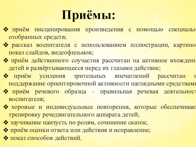приём действенного соучастия рассчитан на активное вхождение детей в развёртывающееся перед их глазами действие;