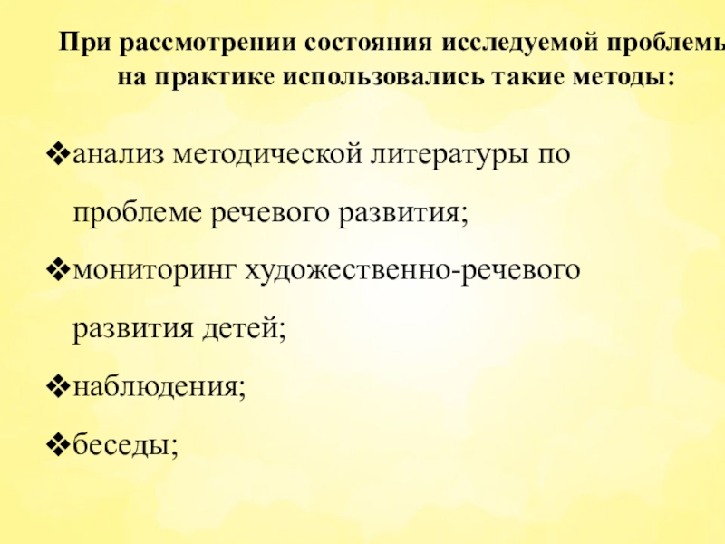 Слайд 8При рассмотрении состояния исследуемой проблемы на практике использовались такие методы: