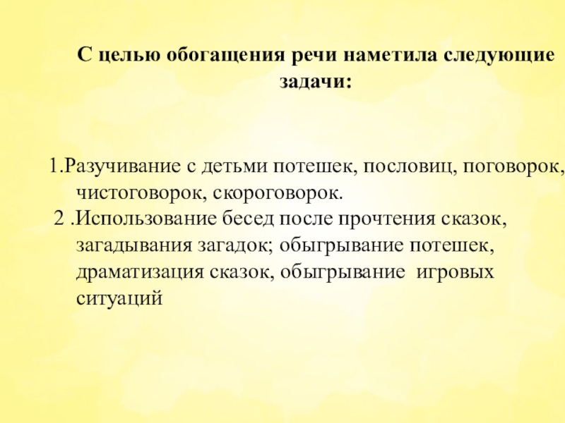 Словесные методы помогали формировать у детей эмоционально-положительное отношение к жанрам устного народного творчества, позволяли в кратчайший срок передать детям информацию.