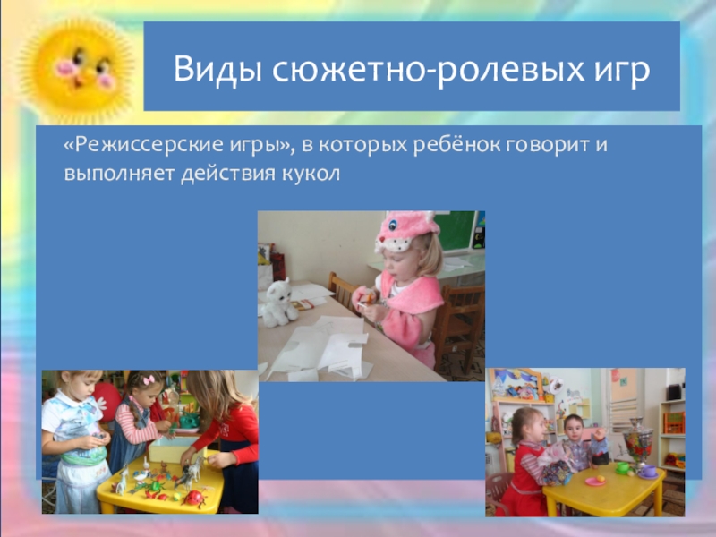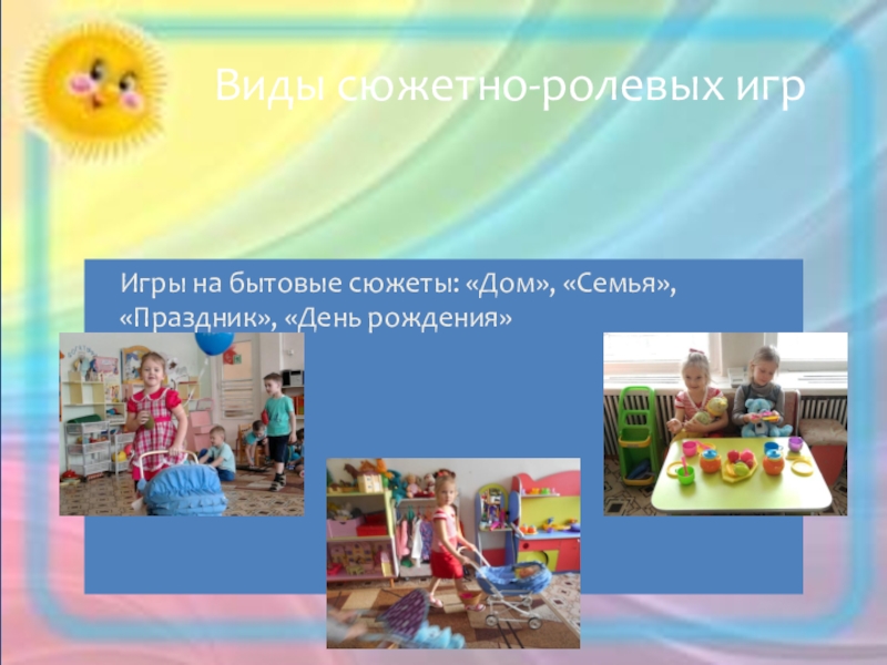 3. Оборудование предметно-игровой среды в соответствии с возрастными особенностями и выбранной темой игры. Следует обратить особое внимание на то, что игрушки должны находиться в свободном доступе в поле зрения ребёнка. Для этого игровую среду организуют таким образом, чтобы ребёнок мог легко дотянуться до любой игрушки и использовать её в ходе сюжетно-ролевой игры.