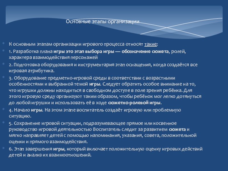 6. Этап завершения игры, который включает положительную оценку игровых действий детей и анализ их взаимоотношений.