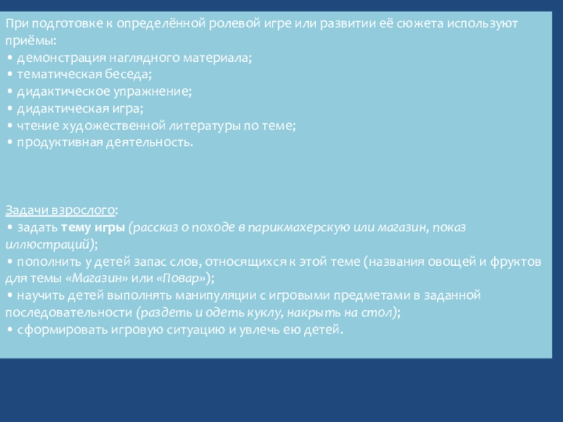 5. Сохранение игровой ситуации, подразумевающее прямое или косвенное руководство игровой деятельностью Воспитатель следит за развитием сюжета и мягко направляет детей с помощью напоминания, указания, совета, положительной оценки и прямого взаимодействия.