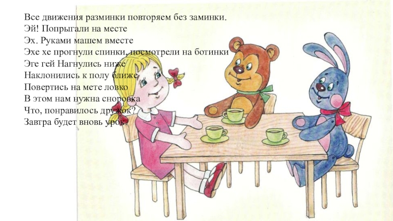 Все движения разминки повторяем без заминки.Эй! Попрыгали на местеЭх. Руками машем вместеЭхе хе прогнули спинки, посмотрели на ботинкиЭге гей Нагнулись нижеНаклонились к полу ближеПовертись на мете ловкоВ этом нам нужна сноровкаЧто, понравилось дружок?Завтра будет вновь урок.