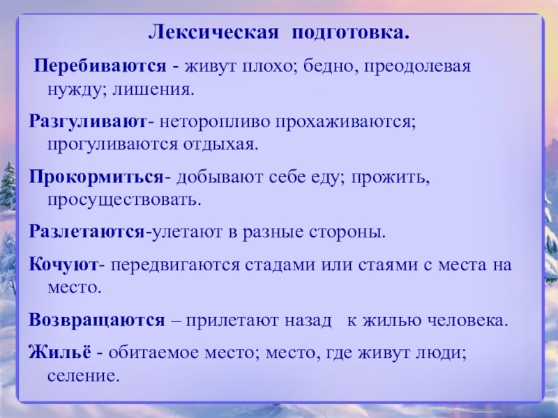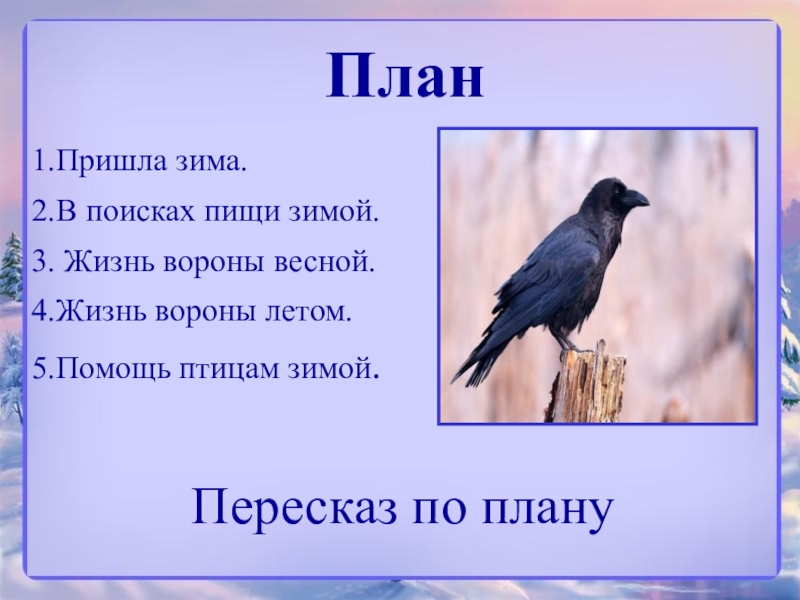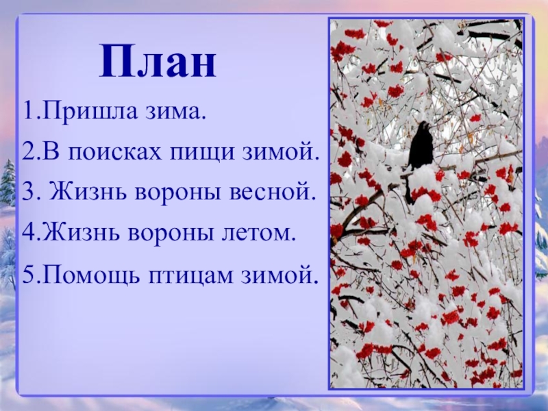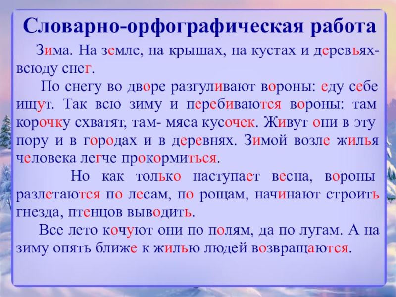 По снегу во дворе разгуливают вороны: еду себе ищут. Так всю зиму и перебиваются вороны: там корочку схватят, там- мяса кусочек. Живут они в эту пору и в городах и в деревнях. Зимой возле жилья человека легче прокормиться.