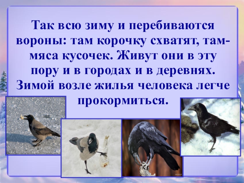 Слайд 12Так всю зиму и перебиваются вороны: там корочку схватят, там- мяса