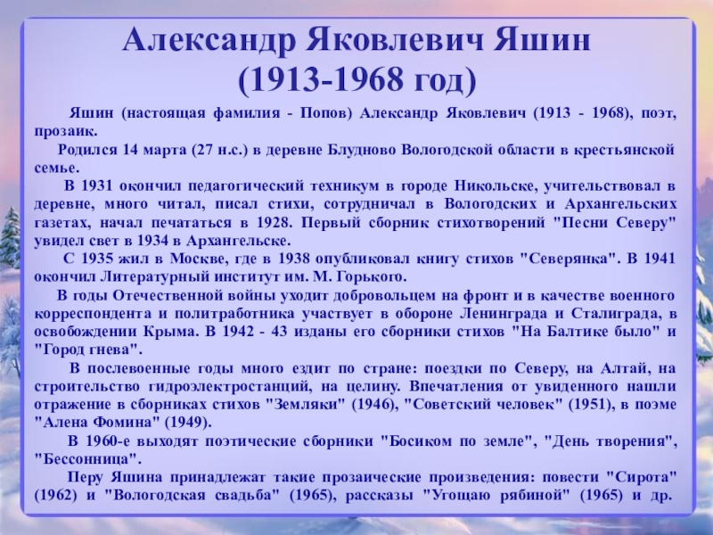 Перу Яшина принадлежат такие прозаические произведения: повести "Сирота" (1962) и "Вологодская свадьба" (1965), рассказы "Угощаю рябиной" (1965) и др.