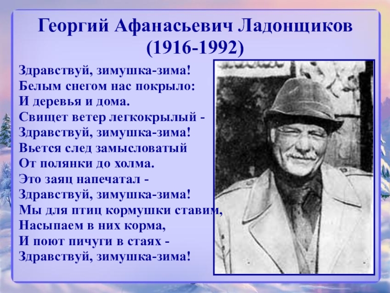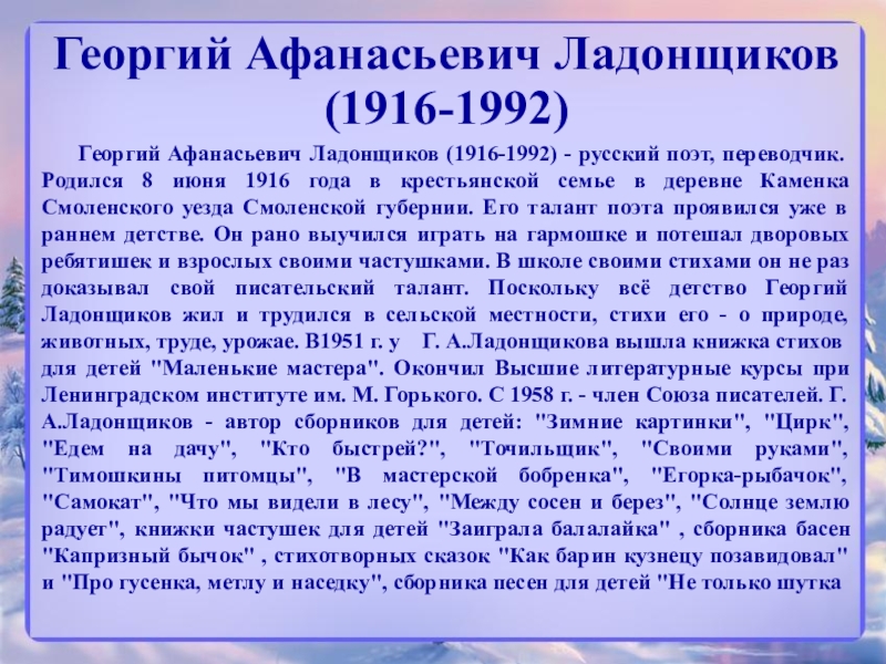 русский поэт, переводчик. Родился 8 июня 1916 года в крестьянской семье в деревне Каменка Смоленского уезда Смоленской губернии. Его талант поэта проявился уже в раннем детстве. Он рано выучился играть на гармошке и потешал дворовых ребятишек и взрослых своими частушками. В школе своими стихами он не раз доказывал свой писательский талант. Поскольку всё детство Георгий Ладонщиков жил и трудился в сельской местности, стихи его - о природе, животных, труде, урожае. В1951 г. у Г. А.Ладонщикова вышла книжка стихов для детей "Маленькие мастера". Окончил Высшие литературные курсы при Ленинградском институте им. М. Горького. С 1958 г. - член Союза писателей. Г. А.Ладонщиков - автор сборников для детей: "Зимние картинки", "Цирк", "Едем на дачу", "Кто быстрей?", "Точильщик", "Своими руками", "Тимошкины питомцы", "В мастерской бобренка", "Егорка-рыбачок", "Самокат", "Что мы видели в лесу", "Между сосен и берез", "Солнце землю радует", книжки частушек для детей "Заиграла балалайка" , сборника басен "Капризный бычок" , стихотворных сказок "Как барин кузнецу позавидовал" и "Про гусенка, метлу и наседку", сборника песен для детей "Не только шутка