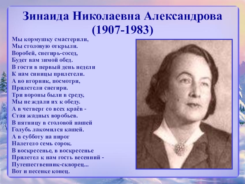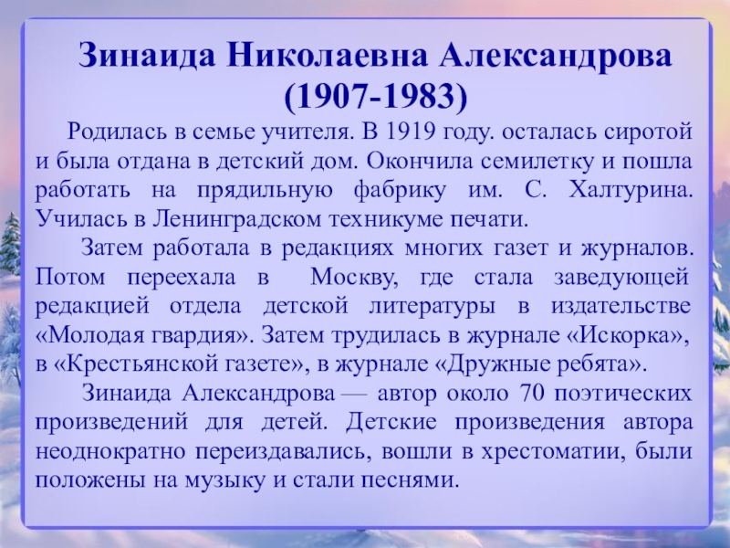 Зинаида Александрова — автор около 70 поэтических произведений для детей. Детские произведения автора неоднократно переиздавались, вошли в хрестоматии, были положены на музыку и стали песнями.