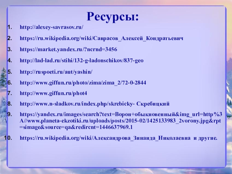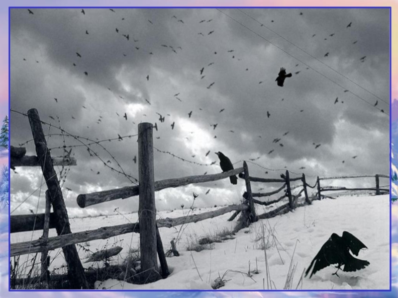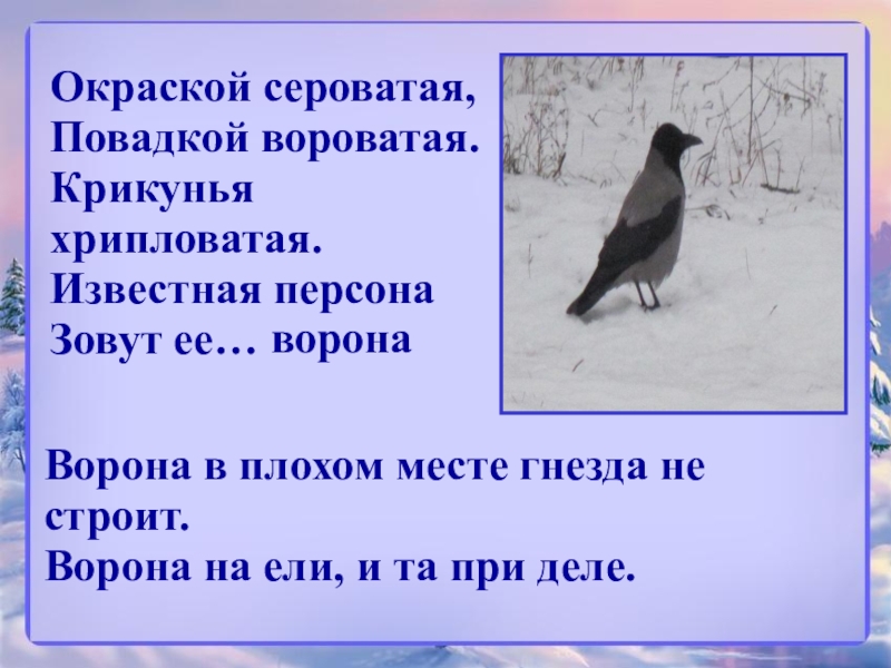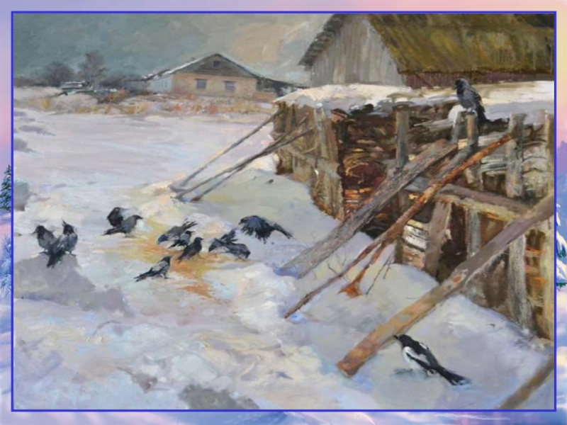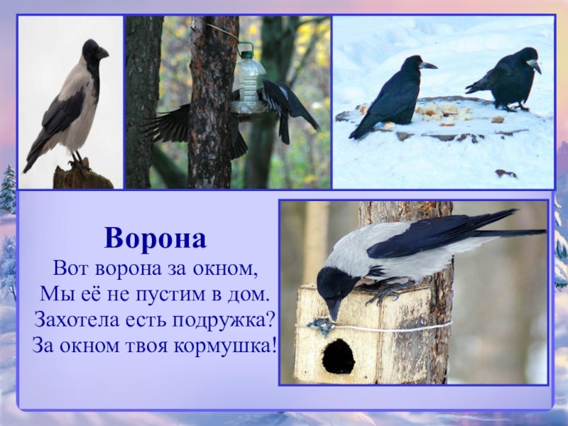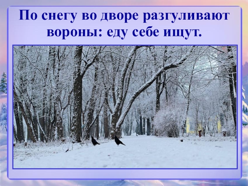 Слайд 11По снегу во дворе разгуливают вороны: еду себе ищут.