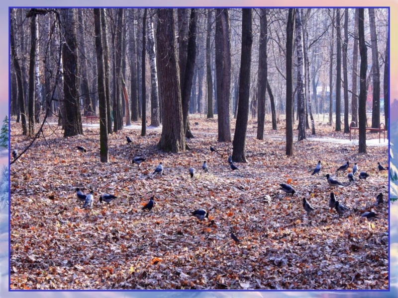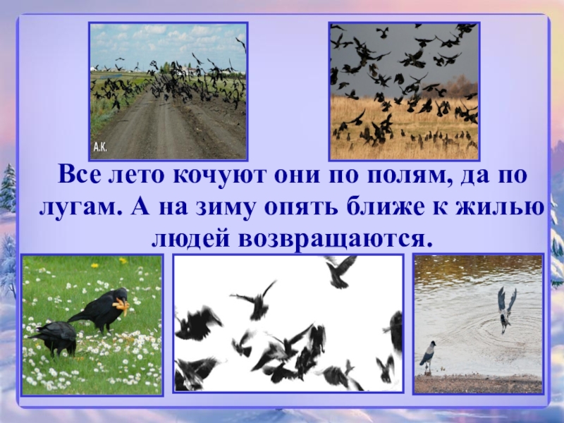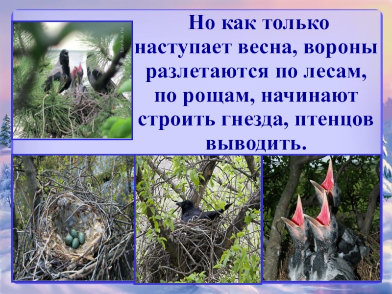 Слайд 13 Но как только наступает весна, вороны разлетаются по лесам, по
