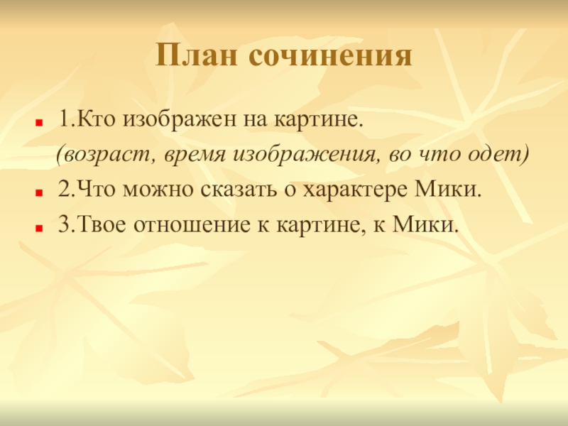 План сочинения1.Кто изображен на картине.  (возраст, время изображения, во что одет)2.Что можно сказать о характере Мики.3.Твое
