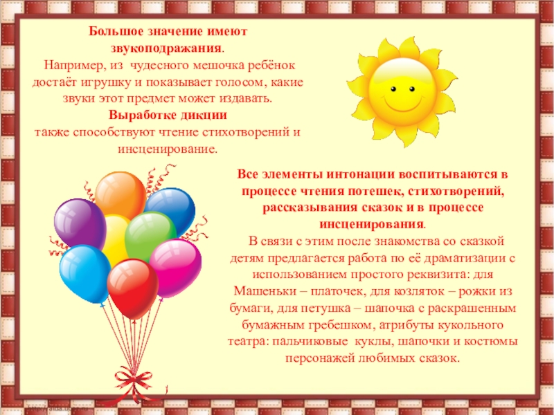Все элементы интонации воспитываются в процессе чтения потешек, стихотворений, рассказывания сказок и в процессе инсценирования.