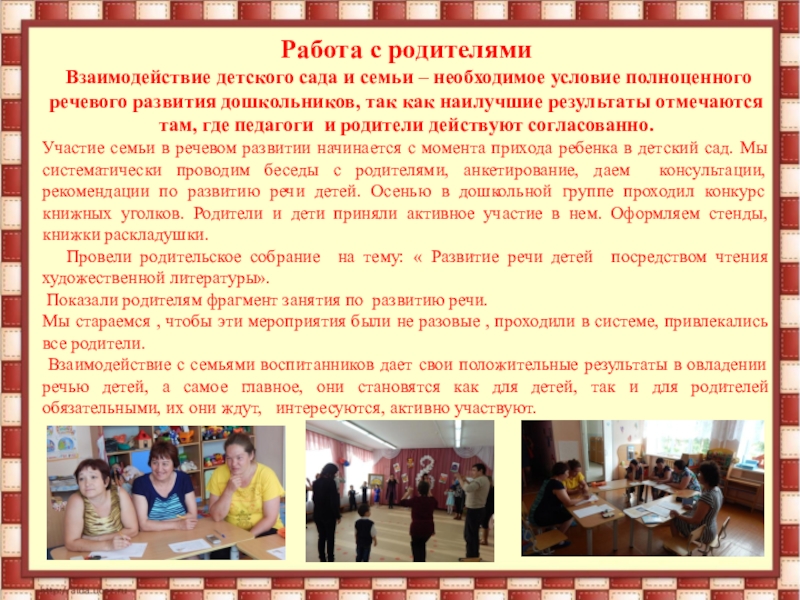 полноценного речевого развития дошкольников, так как наилучшие результаты отмечаются там, где педагоги и родители действуют согласованно.