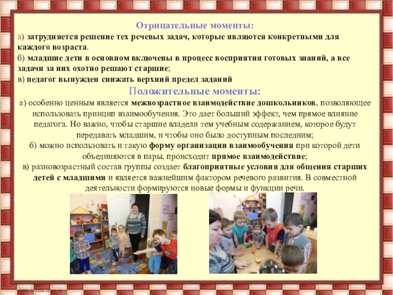а) особенно ценным является межвозрастное взаимодействие дошкольников, позволяющее использовать принцип взаимообучения. Это дает больший эффект, чем прямое влияние педагога. Но важно, чтобы старшие владели тем учебным содержанием, которое будут передавать младшим, и чтобы оно было доступным последним;