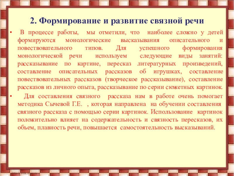 Для составления связного рассказа нам в работе очень помогает методика Сычевой Г.Е. , которая направлена на обучении составления связного рассказа с помощью серии картинок. Использование картинок положительно влияет на содержательность и связность пересказов, их объем, плавность речи, повышается самостоятельность высказываний.