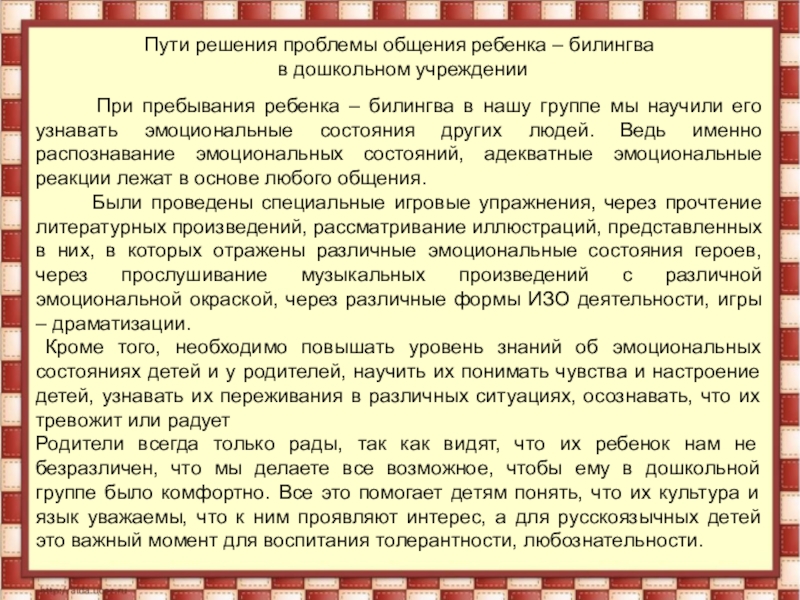 Возникающие отрицательные ситуации, невнимательность (как кажется двуязычным детям) со стороны взрослых и детей, неумение справиться с этой проблемой приводят к нарушению эмоционального состояния ребенка.