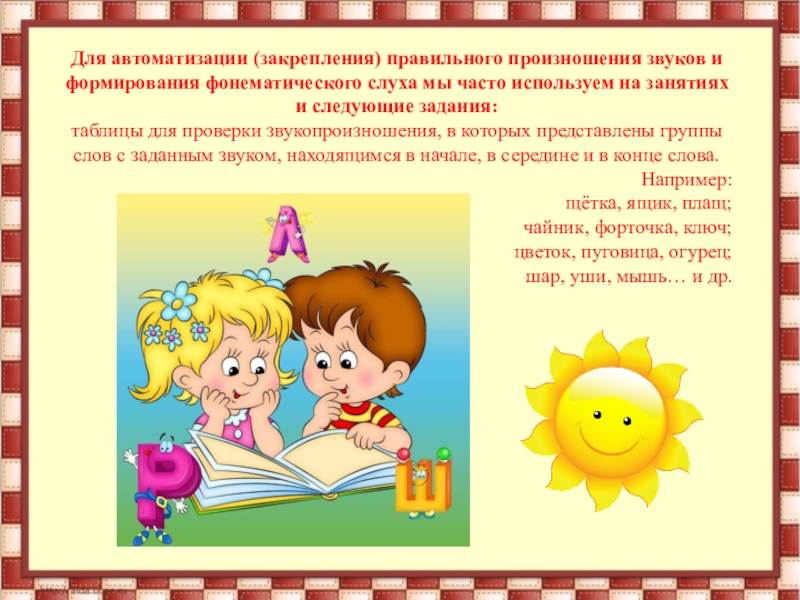 Слайд 10Для автоматизации (закрепления) правильного произношения звуков и формирования фонематического слуха мы