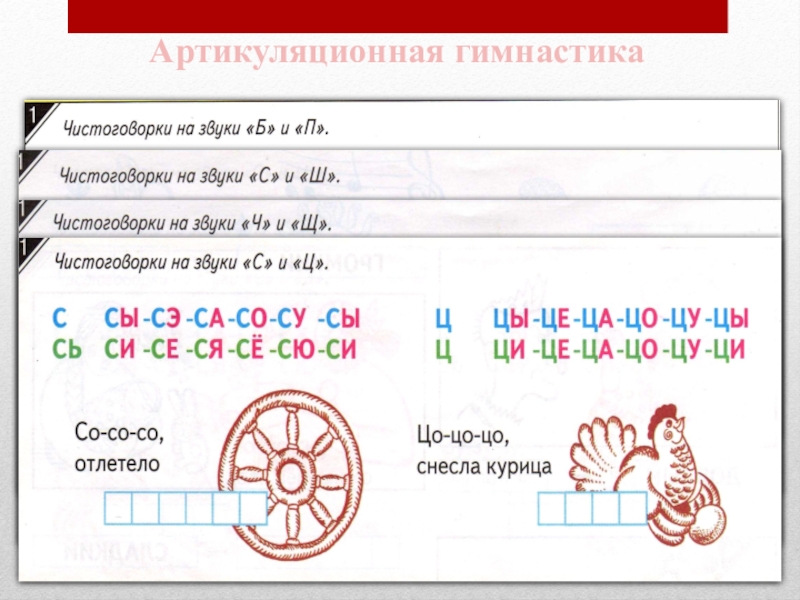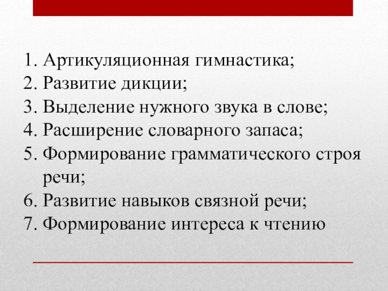 Артикуляционная гимнастика;Развитие дикции;Выделение нужного звука в слове;Расширение словарного запаса;Формирование грамматического строя речи;Развитие навыков связной речи;Формирование интереса к чтению