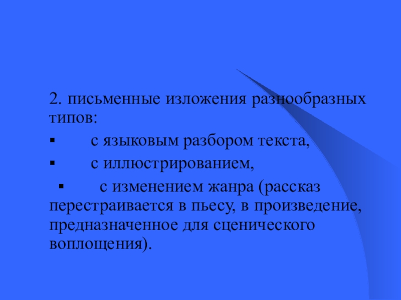 ▪ с изменением жанра (рассказ перестраивается в пьесу, в произведение, предназначенное для сценического воплощения).