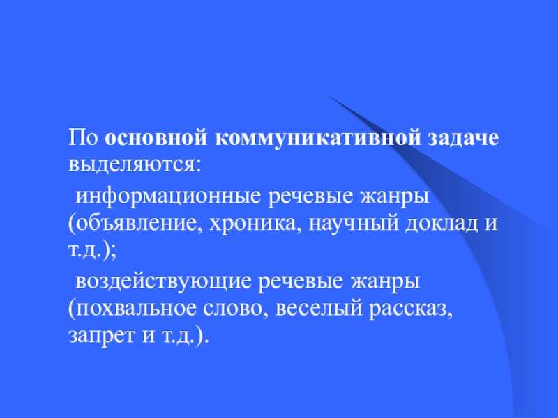 воздействующие речевые жанры (похвальное слово, веселый рассказ, запрет и т.д.).