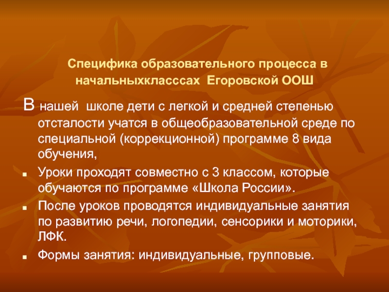 В нашей школе дети с легкой и средней степенью отсталости учатся в общеобразовательной среде по специальной (коррекционной) программе 8 вида обучения,