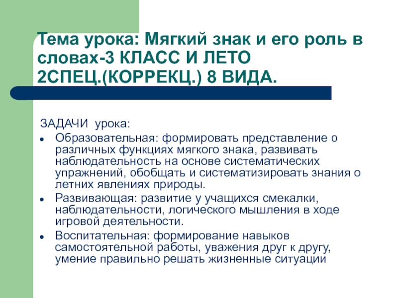 Современная эпоха перемен способствовала не только положительным инновациям в школьной жизни, но и привела к тому, что значительное количество детей уже в начальной школе не осваивают новые программы, а введение стандартов нового поколения приведет на мой взгляд к большему количеству таких детей, поэтому программа специальных (коррекционных) образовательных учреждений 8 вида обучения направлена на компенсирующее обучение, возможность адаптации более слабого ребенка к школьной жизни, развитие его индивидуальных особенностей, учитывая его психологические и интеллектуальные способности, предмет окружающего мира является в этом отношении одним из главных.
