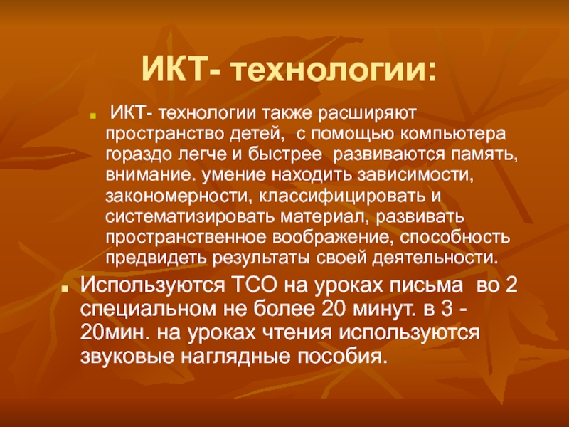 Используются ТСО на уроках письма во 2 специальном не более 20 минут. в 3 - 20мин. на уроках чтения используются звуковые наглядные пособия.
