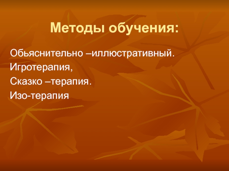Использую различные методы обучения: диагностика, обьяснение, игротерапия, сказкотерапия.