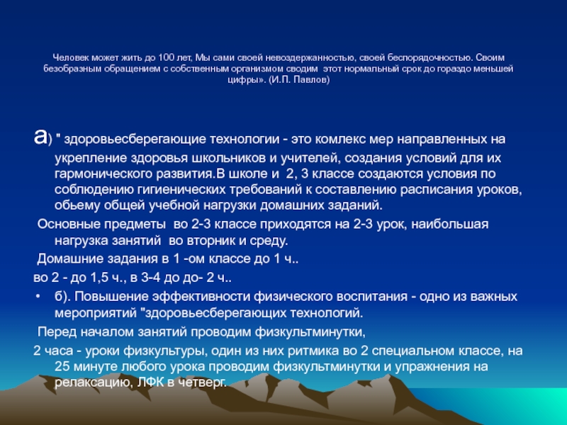беспорядочностью. Своим безобразным обращением с собственным организмом сводим этот нормальный срок до гораздо меньшей цифры». (И.П. Павлов)