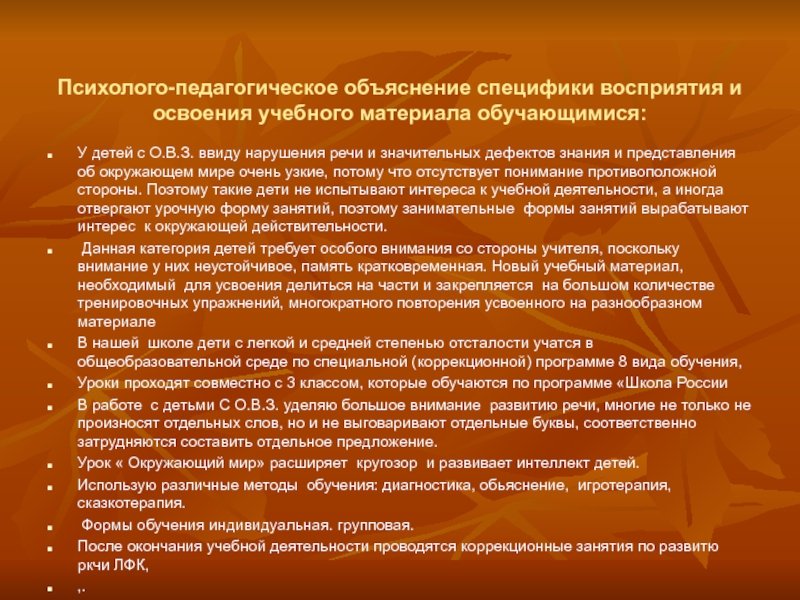 с О.В.З. ввиду нарушения речи и значительных дефектов знания и представления об окружающем мире очень узкие, потому что отсутствует понимание противоположной стороны. Поэтому такие дети не испытывают интереса к учебной деятельности, а иногда отвергают урочную форму занятий, поэтому занимательные формы занятий вырабатывают интерес к окружающей действительности.