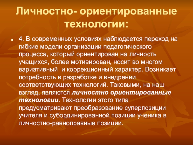 организации педагогического процесса, который ориентирован на личность учащихся, более мотивирован, носит во многом вариативный и коррекционный характер. Возникает потребность в разработке и внедрении соответствующих технологий. Таковыми, на наш взгляд, являются личностно ориентированные технологии. Технологии этого типа предусматривают преобразование суперпозиции учителя и субординированной позиции ученика в личностно-равноправные позиции.