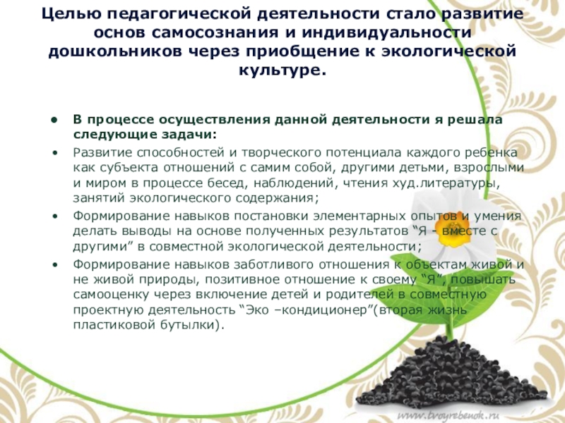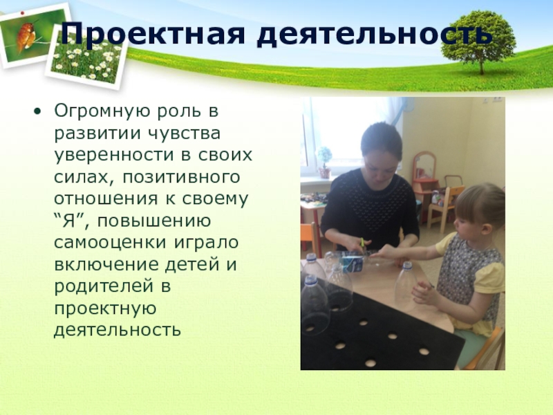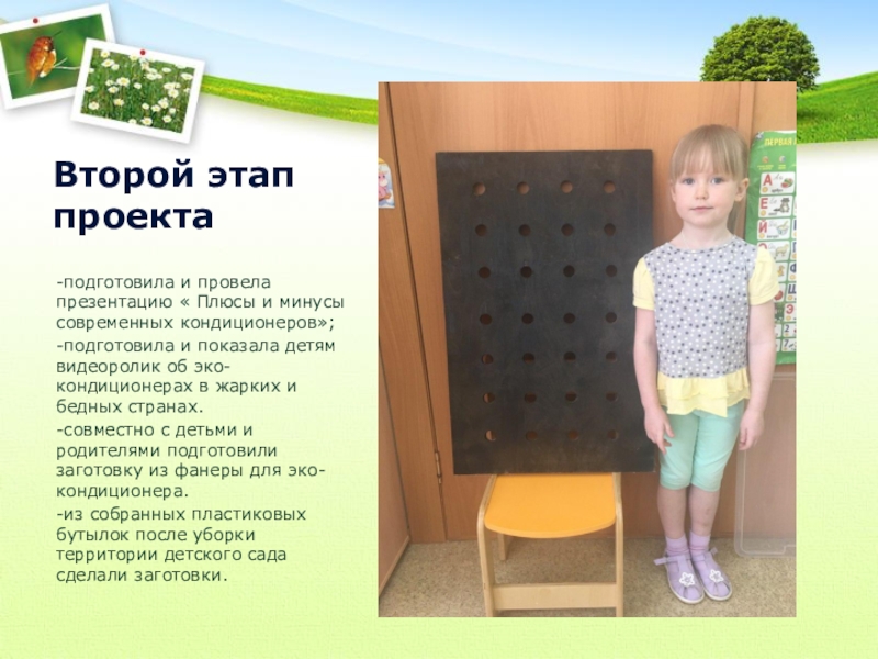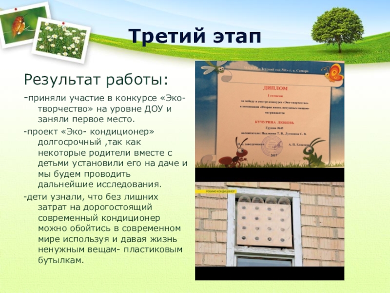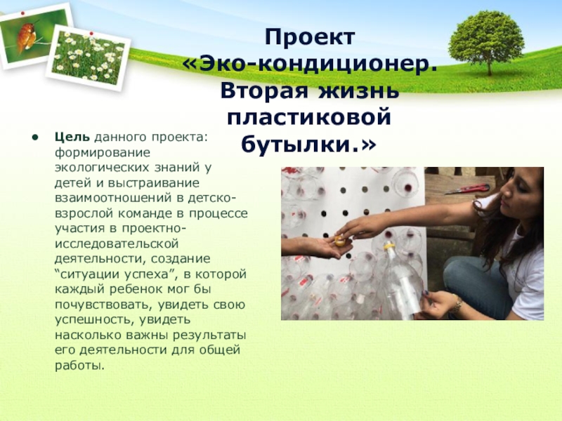 Формирование навыков заботливого отношения к объектам живой и не живой природы, позитивное отношение к своему “Я”, повышать самооценку через включение детей и родителей в совместную проектную деятельность “Эко –кондиционер”(вторая жизнь пластиковой бутылки).