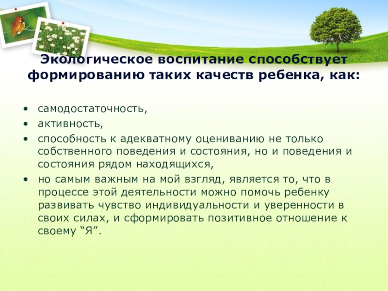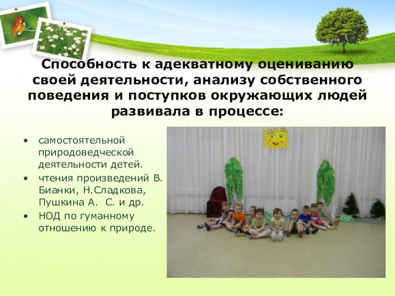 Развитие способностей и творческого потенциала каждого ребенка как субъекта отношений с самим собой, другими детьми, взрослыми и миром в процессе бесед, наблюдений, чтения худ.литературы, занятий экологического содержания;