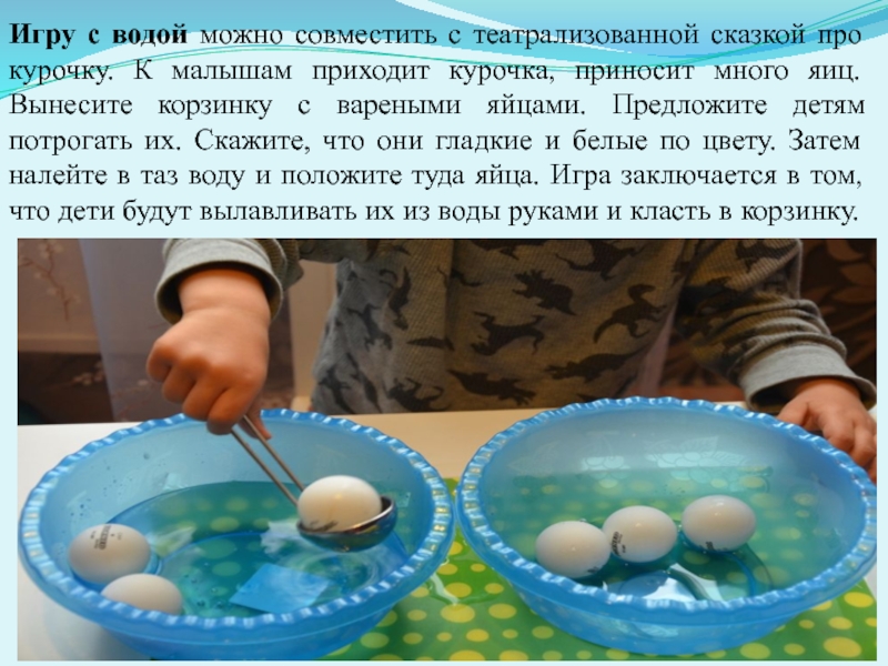 Слайд 23Игру с водой можно совместить с театрализованной сказкой про курочку. К