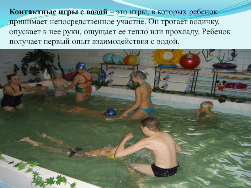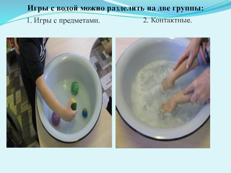 Слайд 9Контактные игры с водой – это игры, в которых ребенок принимает