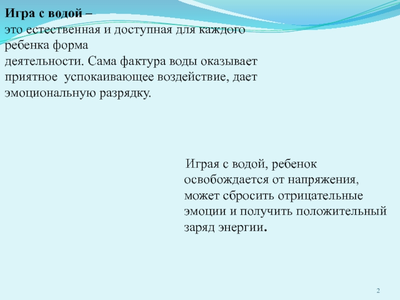 Слайд 2 Играя с водой, ребенок освобождается от напряжения, может