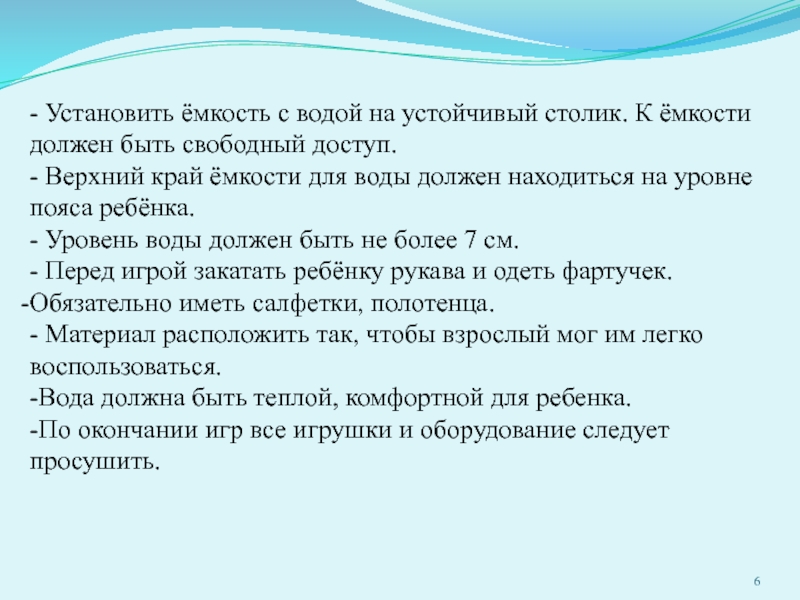 - Верхний край ёмкости для воды должен находиться на уровне пояса ребёнка.