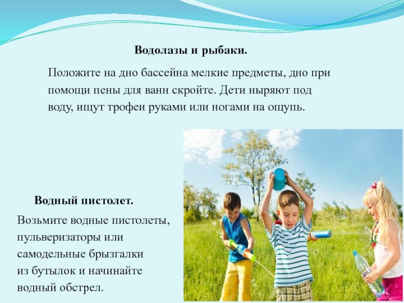 Слайд 19Предложите родителям несколько идей веселых водных игр с детьми, которые можно