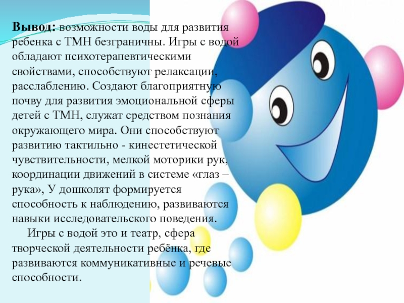 Вывод: возможности воды для развития ребенка с ТМН безграничны. Игры с