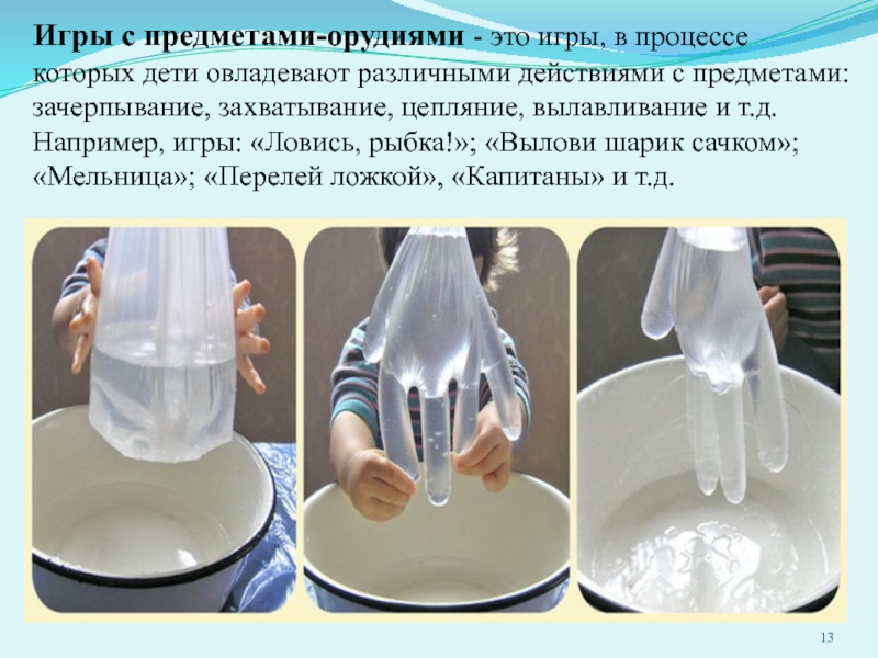 Слайд 13Игры с предметами-орудиями - это игры, в процессе которых дети овладевают