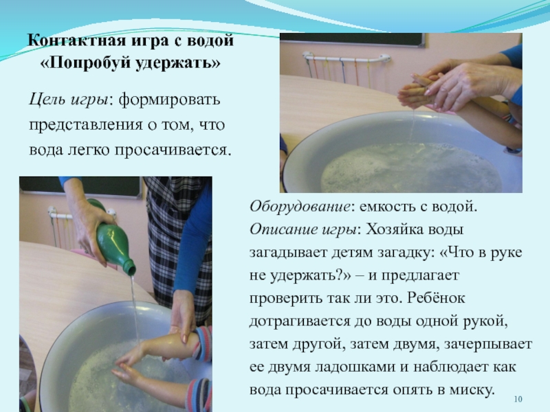 Слайд 10Контактная игра с водой «Попробуй удержать»