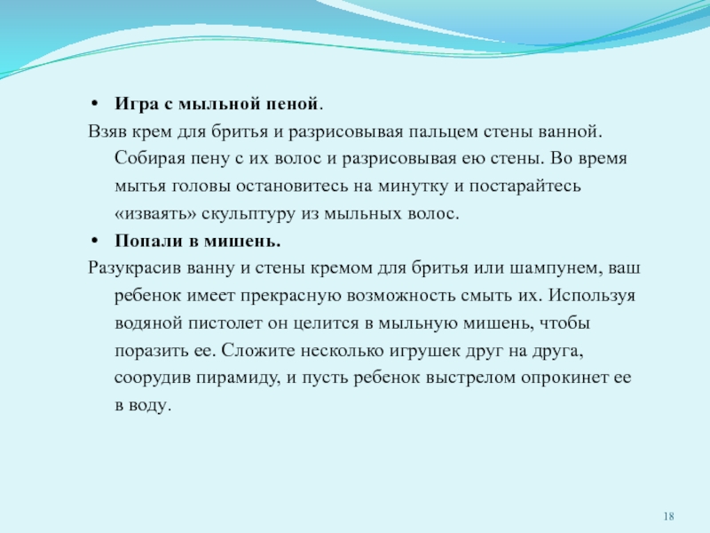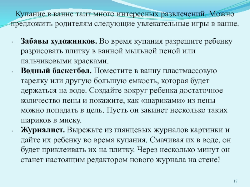 Слайд 17Купание в ванне таит много интересных развлечений. Можно предложить родителям следующие