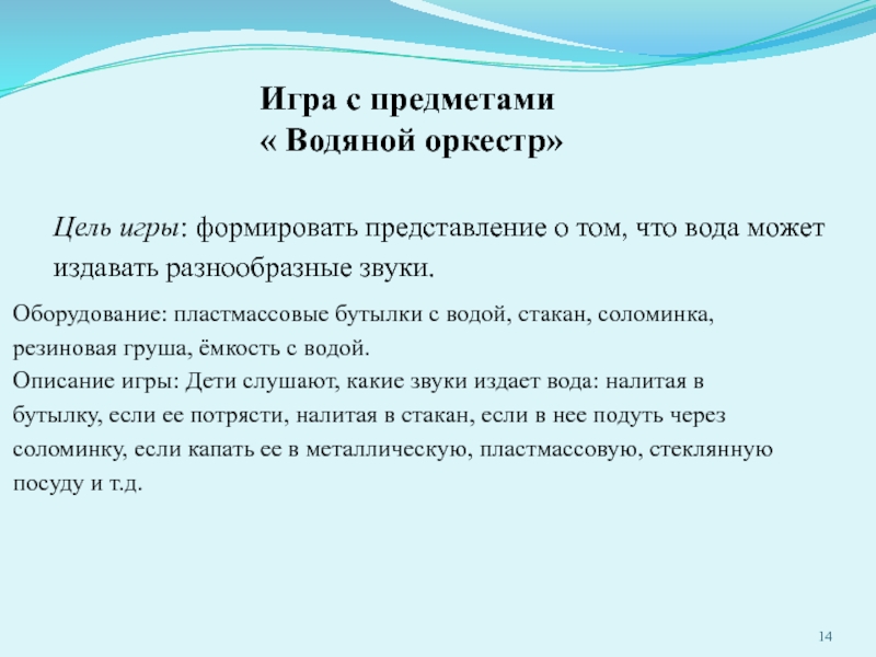 Слайд 14Цель игры: формировать представление о том, что вода может издавать разнообразные