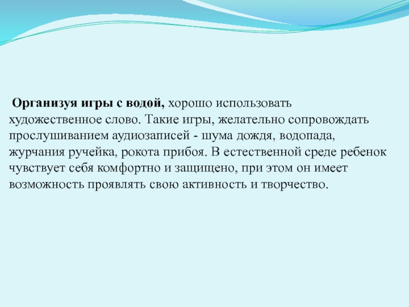 Слайд 22 Организуя игры с водой, хорошо использовать художественное слово. Такие игры, желательно